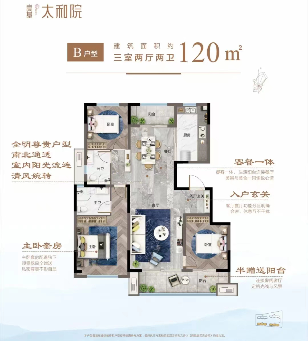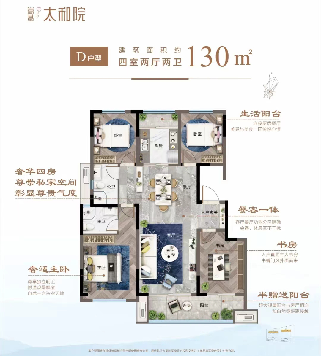 嵩基太和院扼守登封新區(qū)東大門,南臨少林大道,東臨太和路;K2地鐵線(規(guī)劃中)從容換乘,四通八達;瞬息之間從容穿行城市,串聯(lián)起半小時都市生活圈。外立面匯國韻丹青,筑新中式大宅,甄選平板瓦及真石漆。該地塊匠心打造4棟低密闊景大宅,容積率僅1.88。沿襲新中式園林精髓,遵循禮序、禪境、樂居、匠心等設(shè)計理念,藏納東方府門大境;全齡活動中心,構(gòu)筑三代人的溫馨時光;中央景觀庭院,彰顯東方府院氣質(zhì);項目總用地面積15343㎡,總建筑面積39828㎡,其中地上29008㎡,規(guī)劃221戶,建筑密度約為:23.23%,綠地率約為:30.07%,車位配比1:1.1。項目匠造120-130㎡理想舒居,戶戶南北通透,寬廳極致視野,賦予空間更多可能。戶型通過科學規(guī)劃,有效控制面積,加強玄關(guān)、走道利用率,換取品質(zhì)空間提升;幸福系120㎡的三房擁有市場上主流產(chǎn)品面積段的功能和三面寬采光,南北三陽臺;130㎡四房擁有市場上135-160㎡主流產(chǎn)品面積段的四房功能和三面寬采光。目前準現(xiàn)房銷售中,今年買,明年?。?/p>