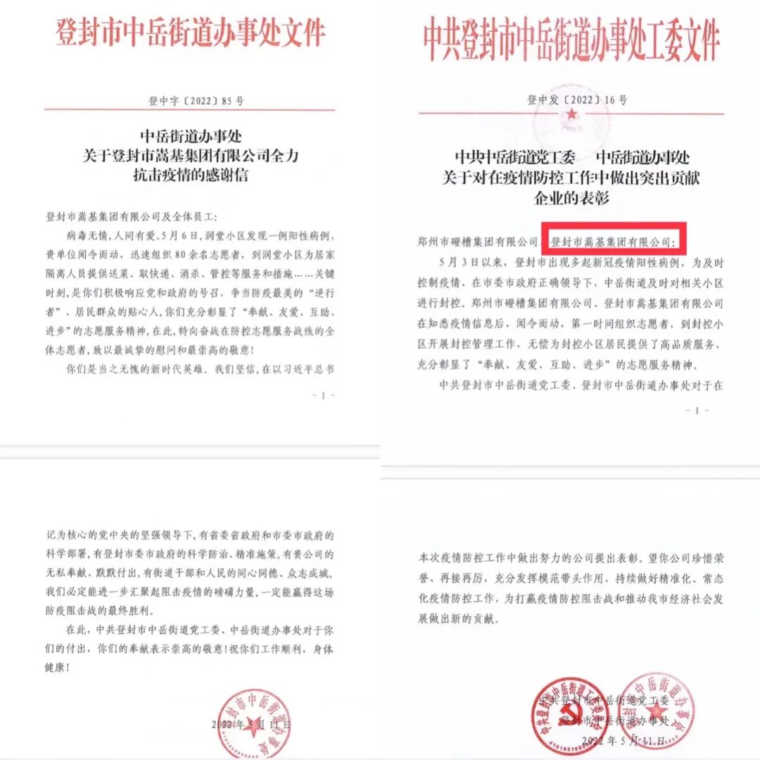 5月11日,中共登封市中岳街道辦事處下發(fā)《關(guān)于對在疫情防控工作中做出突出貢獻企業(yè)的表彰》,對嵩基集團第一時間組織志愿者到封控小區(qū)開展封控管理工作表示衷心的感謝。